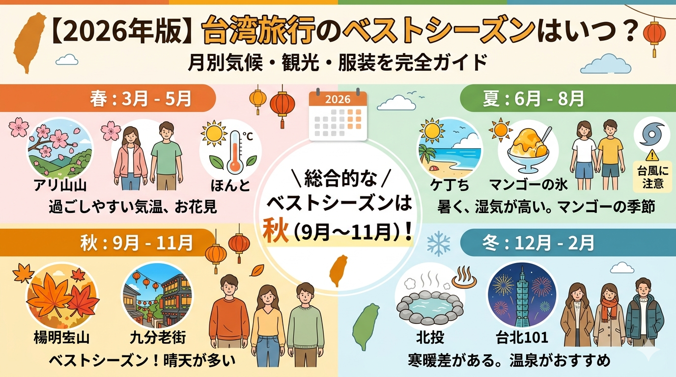 台湾は一年中旅行できる国ですが、快適さとリスクのバランスを考えると、10〜11月か3〜4月が圧倒的におすすめです。